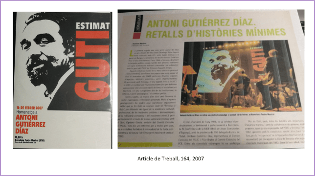 Vaig tenir el privilegi de parlar (amb molts altres companys i companyes que van participar, entre ells Anxo Guerreiro “Geluco”), a l’acte d’homenatge Estimat Guti que es va fer el 16 de febrer al Teatre Musical de Barcelona. També vaig voler escriure a Treball, 164, començament de l’any 2007 aquests “retalls d’històries mínimes”.