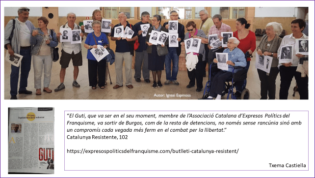 Quan es va tancar la Model, l’any 2017 es va fer una exposició “La Model ens parla”, ens van convidar a visitar-la. Doncs bé, ni El Guti, ni el Cipriano, ni en Rozas, ni Tomasa Cuevas…, apareixien. La resistència guerrillera, les lluites obreres, estudiantils, el combat dels anarquistes, socialistes, comunistes, la gent de CCOO i del PSUC havien estat escombrats de la història de la presó. No encaixaven amb els “relats” dominants. La nostra ACEPF, vam fer acte de presència i en una de les fotos que jo porto vaig reivindicar la figura del Guti.