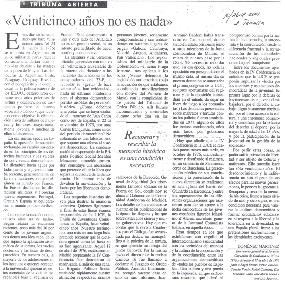Durant la primavera de l’any 1976 volien fer la IV Conferencia de la UJCE (Unión de Juventudes Comunistas de España) a Madrid. Desafiant la dictadura, presidida ja per Arias Navarro, i les bandes paramilitars i feixistes —els sectors més immobilistes del règim—, que assassinaven impunement al carrer. Els comunistes preconitzaven la unitat de totes les forces d’oposició, la ruptura democràtica i l’ocupació de nous espais de llibertat. Aquell mes d’abril el ministre de Governació, Fraga Iribarne, va autoritzar el primer congrés legal de la UGT des de la República, amb molts suports i delegacions internacionals. També va ordenar la detenció d’un grup de dirigents de la UJCE, acusant-los de preparar les mobilitzacions del primer de maig. Tortures i interrogatoris a la DGS, amb l’aplicació de la llei antiterrorista, i presó a Carabanchel i Yeserías. La resignació no va ser la resposta. Milers i milers de joves militants comunistes es van implicar en les mobilitzacions al carrer. També es van prodigar els actes de sortida a la superfície de les nostres organitzacions. Jo em vaig perdre el míting del PSUC a Terrassa del 29 de maig. Tot això ho vam explicar a “25 años no es nada”, l’any 2001, també en aquests articles recents.