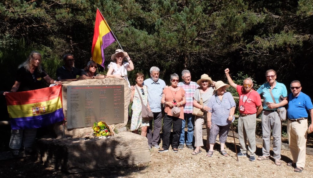Después de una comida fraternal muy cerca de Briviesca emprendimos viaje hacia los montes de la Pedraja, una zona muy próxima a Villafranca Montes de Oca. Aquí, junto al plácido y solitario (a estas horas de la tarde) del camino de Santiago, se encuentra el monumento que recuerda a centenares de personas fusiladas[vii] en los días y meses siguientes a la sublevación. También se encuentran las fosas que la Asociación de familiares de personas asesinadas, han recuperado, y donde han sido exhumados más de cien cuerpos, muchos atados y con bala en el cráneo, aunque muy pocos identificados. El artículo sobre un corazón y 45 cerebros, así como la canción de María Arnal, constituyen un auténtico poemario[viii]. Otros centenares están pendientes de ser encontrados e identificados en este entorno.