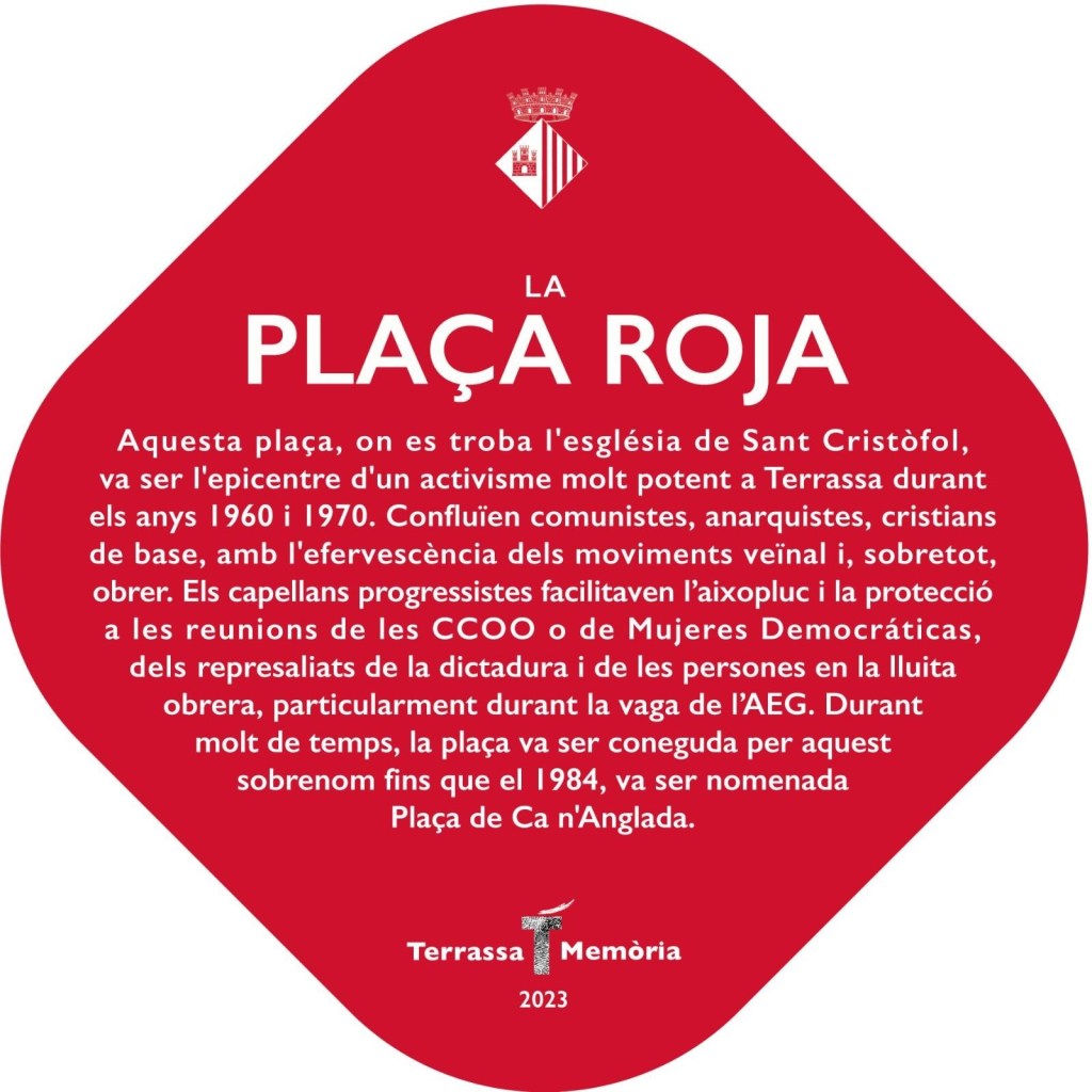Es la misma voluntad que preside el acto de hoy, aquí en esta plaza. Mucha gente joven desconoce el significado de Terrassa, La Roja, tal como era conocida nuestra ciudad en los años 60 y 70. Las huelgas obreras y las manifestaciones para mejorar las condiciones de la gente trabajadora, así como un potente movimiento vecinal, situaron a Terrassa en el centro de las luchas obreras y populares, forjando nuevos espacios de resistencia contra la dictadura franquista. El PSUC, la Juventud Comunista, las incipientes CCOO, los grupos de las comunidades cristianas, la Juventud Obrera Católica, JOC, el movimiento vecinal, el Movimiento de Mujeres Democráticas, y los curas obreros, pagaron un alto precio en multas gobernativas, detenciones, torturas, despidos y otras formas de persecución y represión.