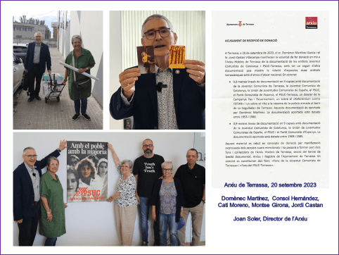 Per aquesta raó estem feliços de poder compartir aquest índex (el Fons Documental de Domènec Martínez i Consol Hernández), que hem dipositat el dia 20 de setembre a l’Arxiu Històric de Terrassa amb molt bona companyia. Reivindicant el temps de les utopies necessàries, les militàncies compartides, i els somnis i sopars a la fresca, al pati de La Cogullada.