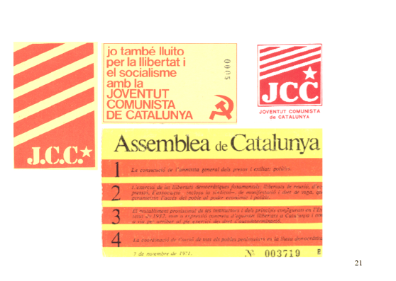 En primer lloc, les publicacions clandestines d’una època (un temps i un país) i de la nostra militància activa a les Joventuts Comunistes de Terrassa, de Catalunya (JCC) i a nivell d’Espanya (UJCE). Des de l’any 1966, ingrés a la JC fins a l’any 1977. També les publicacions referides al PSUC local, Terrassa, al PSUC amb dimensió nacional i al PCE, Partido Comunista de España.