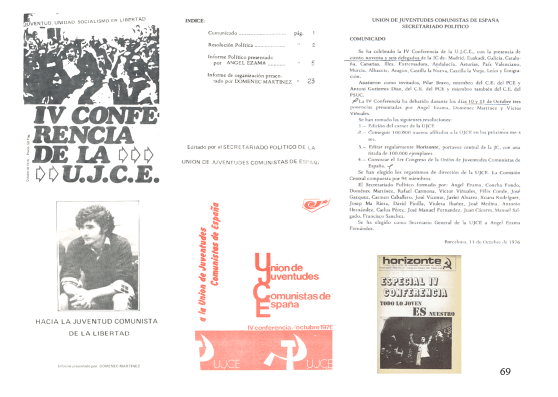 Aquí trobareu informes, guions, publicacions diverses, cartells i les fotografies d’aquesta activitat. M’agrada destacar particularment la celebració de la IV Conferència de la UJCE a Sentmenat i Barcelona, octubre de 1976, i la campanya del Dret a Vot als 18 anys i la participació a les primeres eleccions generals de l’any 1977. També els expedients policials i judicials de la Causa 470/69, detenció Primer de maig, Font de les Canyes (jurisdicció militar, La Model i TOP); i de la detenció i processament del mes d’abril de 1976 (DGS i Carabanchel).