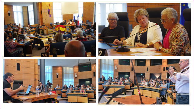 La última jornada se desarrolló en el espacio institucional del Consejo Departamental de Agen (Hotel del Departamento en Agen), donde Françoise Laurent, Viceconsejera Departamental de Antiguos Combatientes y de Memoria nos recordó: “lo que nos enseñan los años oscuros de nuestra historia es la fragilidad de nuestra democracia. En la comodidad de las certezas de hoy, muchos sienten que nuestro sistema democrático es eterno”. Magnífica intervención con traducción simultánea de Isabel Alonso, nuestra coordinadora de la Comisión de Pedagogía de la ACPEPF.