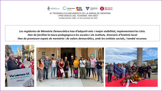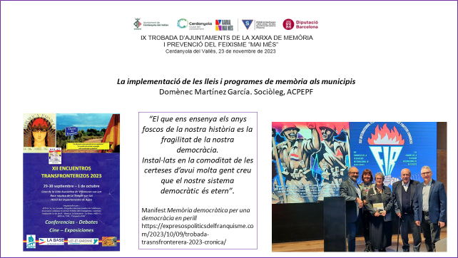 Si volem implementar i fer complir les Lleis de Memòria necessitem incrementar recursos i pressupostos. Ho hem de fer mancomunadament. Vull aprofitar que tenim al Diputat de Memòria, Sr. Jesús Naharro i altres responsables de la DIBA, per demanar una mena d’inventari de les Regidories de Memòria Democràtica o similars d’àmbit local. Actualitzar i conèixer l’estat de la qüestió. També formació i protocols de col·laboració amb les entitats memorialistes, que de forma altruista intenten omplir el que hauria de ser una tasca tècnica i professional de l’Ajuntament. Particularment en tot allò que s’ha esmentat abans: recerca documental de les persones represaliades, itineraris locals de memòria i pedagogia centrada en el coneixement de la història, des de les conquestes democràtiques de la República, derogades per la Dictadura, fins el combat per les llibertats democràtiques.