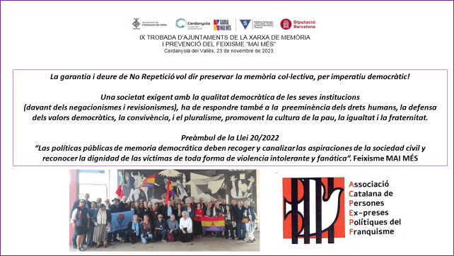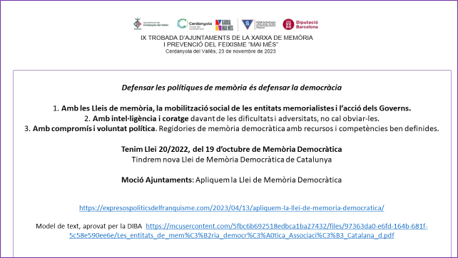Per això és important poder continuar avançant en favor d’una major justícia social, la defensa dels drets humans i dels valors democràtics, en una mateixa seqüència. Amb el desplegament i implementació de la Llei de Memòria Democràtica 2022. Per tal que la memòria històrica i democràtica arribi a les aules i arreli en les noves generacions, i es restitueixi la memòria de totes les víctimes i les persones represaliades per la dictadura als pobles silenciats, i el seu reconeixement en totes les ciutats i en totes les comunitats. Actualitzant la Llei de Memòria Democràtica de Catalunya i fent més operatiu i amb més recursos pedagògics el Memorial Democràtic. Amb el convenciment que la preservació i transmissió de la memòria (com ja s’està fent amb moltes i diverses activitats) constitueix un acte d’afirmació democràtica.
