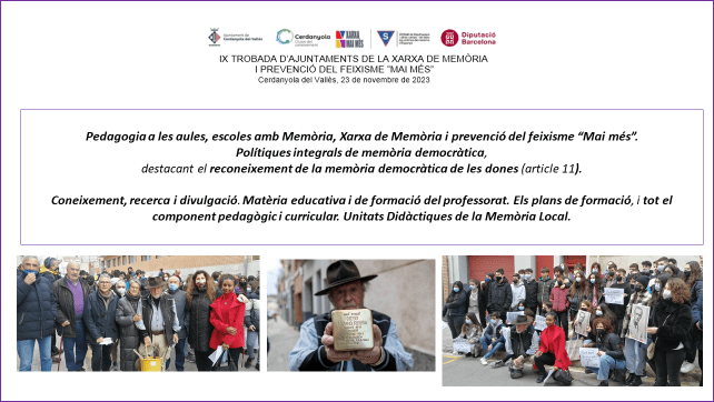 Tercera. La memòria per crear i enfortir la comunitat. Per combatre aquesta malefici interioritzat “no es pot fer res per canviar les coses”, esterilitzant, mitjançant exemples que expliquin justament el contrari. Identificant-los i fent una lectura pedagògica de les lluites socials i dels col·lectius implicats que si van ajudar a canviar les coses. Conscients que la memòria és coneixement i també ha de ser reconeixement. Identificant memòria amb valors ètics i valors democràtics.