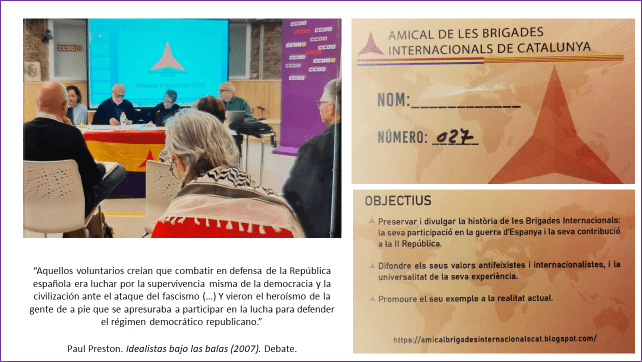 No és una llista de dades o inventari per imperatiu formal, és un manual de memòria molt viva i també molt actual. Més que mai amb els vents que bufen avui a Espanya i a Europa. Tal com s’ha recordat a l’assemblea, durant els anys 1936, 37 i 38, quan el feixisme ja exercia a Europa des dels governs d’Alemanya i Itàlia, els brigadistes (molts d’ells perseguits ja pel nazisme i el feixisme als seus països) van venir a España a defensar la República, que volia dir defensar la democràcia i la llibertat, defensar la legalitat de les institucions democràtiques republicanes, i lluitar contra la intervenció de les tropes de Hitler i Mussolini que van donar suport al cop militar de Franco i els seus aliats. Hem recordat Gaza i Palestina, i com voluntaris palestins i israelians, van lluitar plegats contra el feixisme a les Brigades Internacionals. També van venir xinesos, i de molts altres països. I hem destacat el paper protagonista de les dones i els homes de la Brigada Lincoln, i particularment dels i de les “negres”, com ells i elles es reivindicaven, assumint espais de responsabilitat que se’ls hi negava als seus llocs d’origen, els EUA.