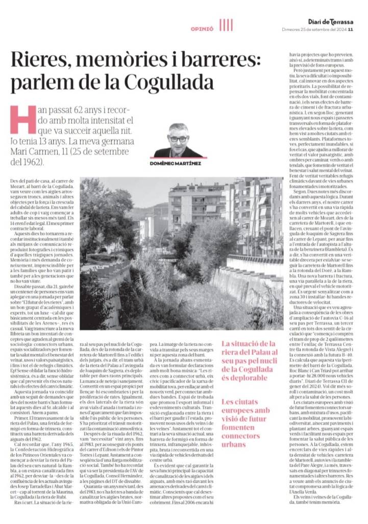 Després de la riuada del 1962 vam “necessitar” 21 anys, fins el 1983, per aconseguir el pont del carrer Edison i els de Pintor Torres i Lepant. Justament com a conseqüència d’una llarga mobilització social. També ho ha recordat qui va ser la Presidenta de l’AAVV de La Cogullada, Consol Hernández, a les pàgines del DT de dissabte, 21 de setembre 2024.