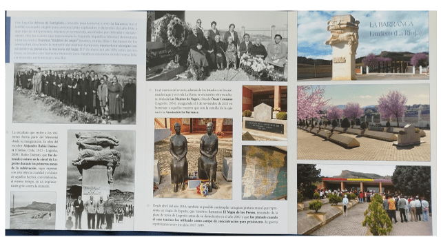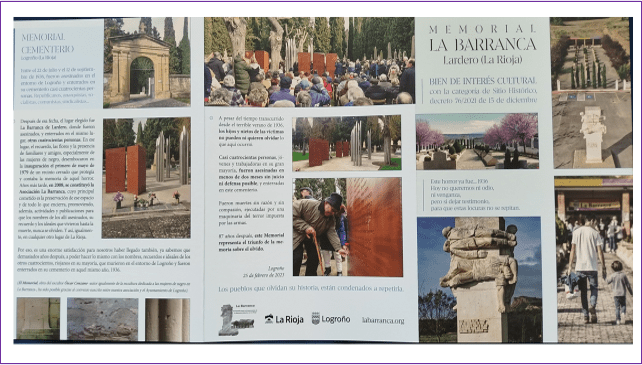 También con publicaciones y libros que merecen ser reseñados. Son magníficos, auténticas joyas, materiales bien cuidados, contenido e ilustraciones. Permitidme una breve referencia. Desde la convocatoria de los encuentros, Dignidad y Memoria(s), hasta la invitación para ese Atardecer en la Barranca, admirando las esculturas, las fosas protegidas de flores, la exposición de las Mujeres de Negro, y conteniendo las emociones en el recital poético y de canciones. Añado el libro de fotografías y textos de Rober Astargano. ¿Cómo se cuenta la historia a través de las generaciones? Editado por el Observatorio de Derechos Humanos, Logroño, en 2021. Dibujos para después de una guerra, es el resultado de una exposición colectiva del 2008, y está prologado por el Juan José Garnica, Presidente de la Universidad Popular de Logroño. “Nacieron estas pinturas y dibujos para formar parte de un libro que es un monumento impresionante a la memoria y la verdad”, una maravilla de catálogo. Conservo también el número de Piedra de Rayo, revista riojana de cultura popular, de marzo de 2016, donde Carlos Muntión Hernáez nos avanza en el prólogo el contenido de un monográfico especial. Informa de la plaza de toros de Logroño convertida en campo de concentración para presos republicanos y del Mapa de los presos que fue rescatado de la picota, ahora a buen resguardo en La Barranca. El tríptico a dos caras del Memorial La Barranca, editado en febrero de 2023, es otro buen ejemplo de divulgación y de cultura memorialista. Información e ilustraciones que en pocas páginas resumen el sentido de este espacio declarado Bien de interés cultural. Un patrimonio ético universal. Aquí se han añadido el Memorial del cementerio de Logroño, más reciente y que también tuvimos ocasión de visitar. Nombre a nombre, para que su testimonio, entierre los discursos de odio, y triunfe la memoria sobre el olvido.