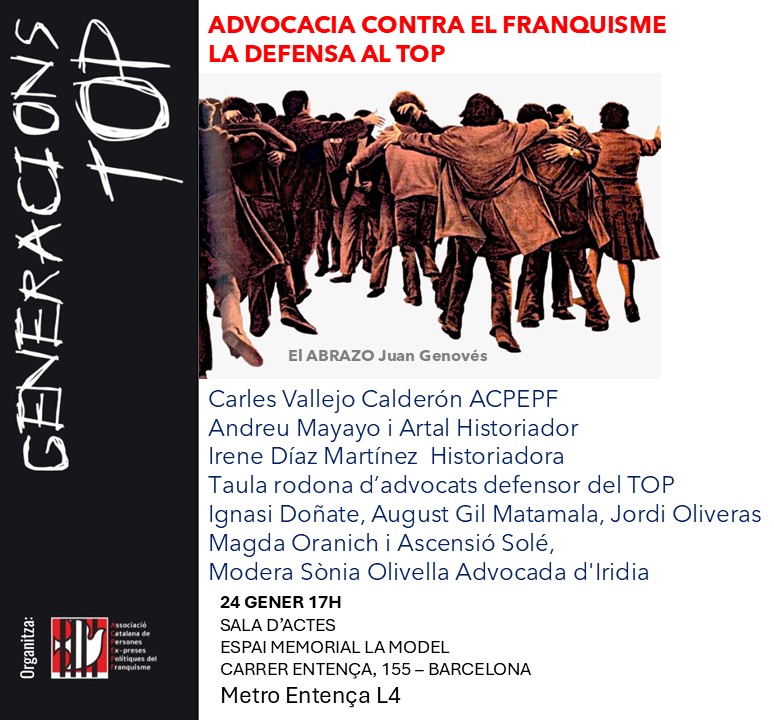 [Este libro es el que me acompaña en las visitas a La Model de Barcelona para conocer la exposición sobre las Generacions TOP, que se inauguró el 20-N de 2024 y que se prolongará hasta el 31 de marzo de 2025. Ilustra vehementemente la atmósfera plomiza y gris que se vivía bajo la dictadura franquista desde 1963, fecha de constitución del Tribunal de Orden Público, hasta su disolución en 1977. Entre 1964 y 1976 el TOP instruyó 22.600 procedimientos que afectaron a más de 50.000 personas directa o indirectamente. Ver «Repressió estatal i violència política al segle XX: canvis i continuïtats en els Tribunals polítics a Espanya, Portugal i Itàlia«. Documents del Memorial Democràtic.]