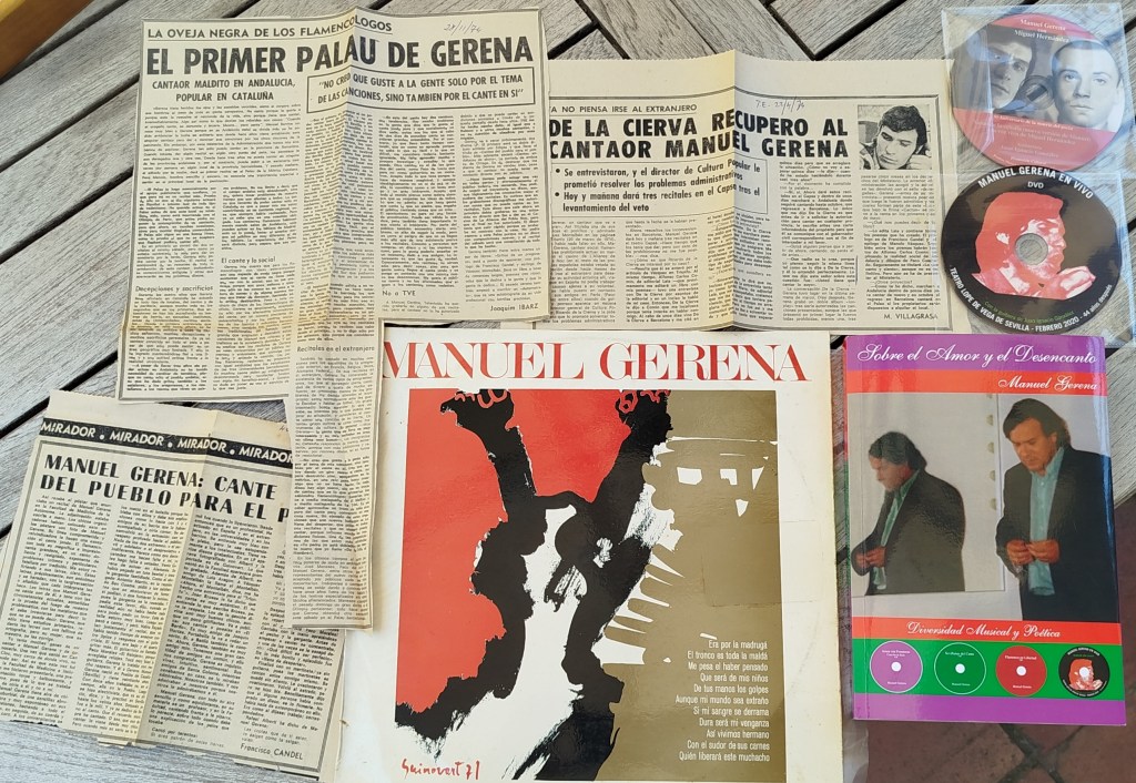 Entre los pliegues de la funda del vinilo LP, he conservado algunos recortes de prensa. El de Paco Candel (inicios de los años 70) es ilustrativo de un tiempo y de un país: “Las letras que Manuel Gerena canta son de él, a tono con las circunstancias actuales, sometidas a la prueba del fuego de nuestra problemática, con las metáforas que él sabe inventarse para decir lo que no se puede decir”. “Venía Gerena de actuar en Alemania. Se había pegado un tute bestial y traía la garganta fastidiada. El abogado Antonio Martín pidió a los asistentes que se abstuvieran de fumar, si podían, o que fumaran lo mínimo pues la garganta se le resecaba”. Otra crónica de Joaquim Ibarz del 1974, evoca el Primer Palau de Gerena, todo un acontecimiento como él mismo nos recordó ayer. “Cantaor maldito en Andalucía, popular en Cataluña”, subtitula el periodista. M. Villagrasa firma otra crónica del mismo año donde narra la cita de Gerena con Ricardo de la Cierva, director de Cultura Popular durante la dictadura, No tiene desperdicio. El Director general le pide que no se vaya al extranjero. “Manuel Gerena cantaor social flamenco, tras prohibírsele actuar en marzo en el casino de l’Aliança de Poble Nou (en el resto de las provincias españolas estaba vetada su actuación desde hacía meses) decidió irse al extranjero”. “Lo único que me dijo De la Cierva es que antes de ir a solicitar la autorización para cantar en cualquier provincia, le escriba antes una carta para que él se comunique con el gobernador civil”. No fue un camino de rosas., prohibiciones, sanciones y largas jornadas a las comisarías de policía, entre ellas, Via Laietana. Conviene no olvidar los tortuosos caminos de la censura.