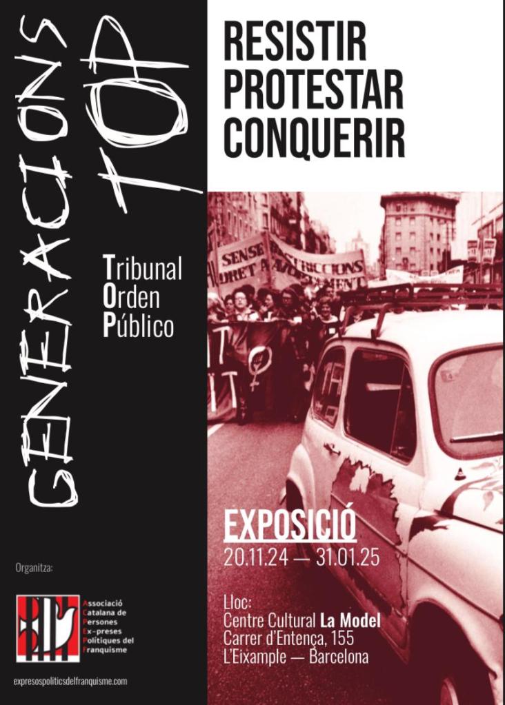 Las dos secuencias posteriores de la Modelo están marcadas por los años de plomo y el terror. El triunfo de la dictadura franquista, el hacinamiento en las cárceles, la represión, las ejecuciones en el campo de la Bota, y la larga noche de la dictadura, las torturas sistematizadas, exilio y persecuciones. También con la Resistencia y protesta organizada, la no resignación. durante los años 60 y 70, que hemos ilustrado en las Exposición “Generaciones TOP”. Y que transitará ahora por diferentes municipios y ciudades. Dejo en formato PDF, el guión de esta presentación[v].