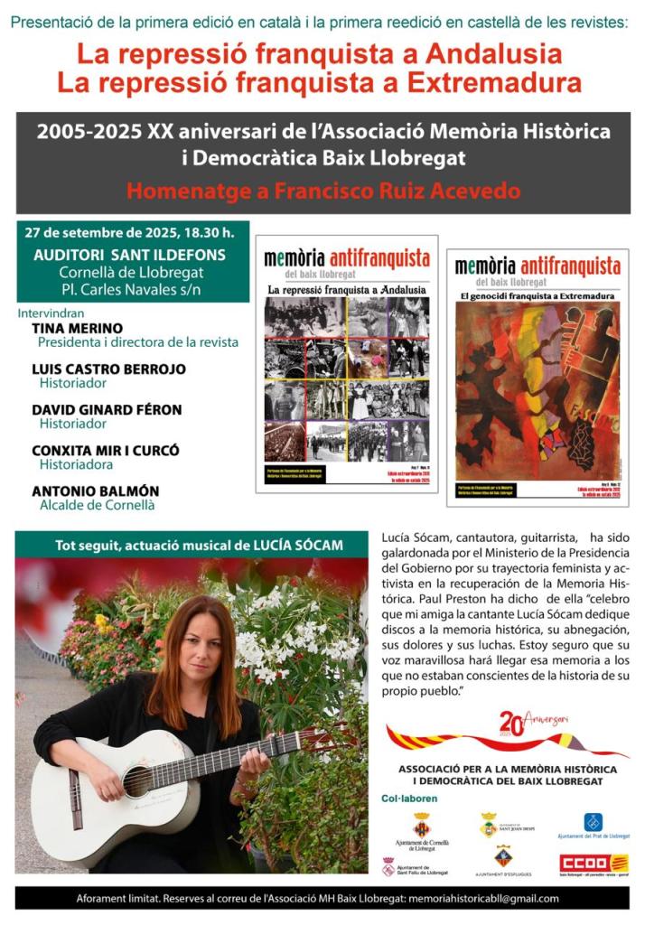 La mateixa jornada del 27 de setembre vam recordar els darrers afusellaments de la dictadura en un altre marc, l’Auditori de Sant Ildefons de Cornellà, reivindicant els 20 anys de l’Associació per a la Memòria Històrica i Democràtica del Baix Llobregat. També per retre homenatge al primer president de l’entitat Paco Ruíz Acevedo. S’ha fet balanç de la feina feta, molta, particularment del treball de recerca i les publicacions de la memòria antifranquista. S’ha vindicat el valor de la consciència social, les lluites obreres i populars i de la memòria democràtica del Baix Llobregat. Un patrimoni que cal preservar. No podien faltar les cançons, en aquest cas de Lucía Socam, reivindicant els valors republicans, tampoc el crit contra el genocidi a Gaza, i la solidaritat amb el poble de Palestina.