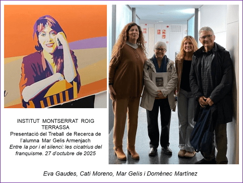 En esta entrada del Blog añado algunos enlaces de las actividades del año 2017, cuando se colocó la placa con motivo del 50 aniversario, y algunas fotografías. También de la actividad Testimonios al aula en el Instituto Montserrat Roig de Terrassa, 27 de octubre de 2025.